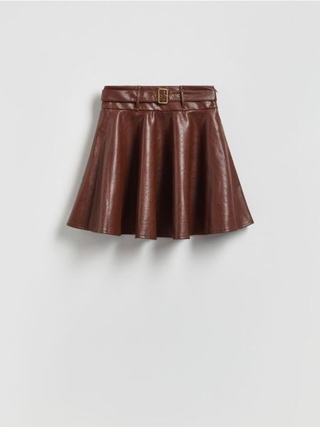 Spódnica o rozkloszowanym kroju, wykonana z imitacji skóry.