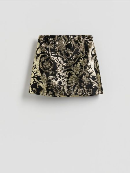 Spódnica o prostym kroju, wykonana z tkaniny z metalizowaną nicią.