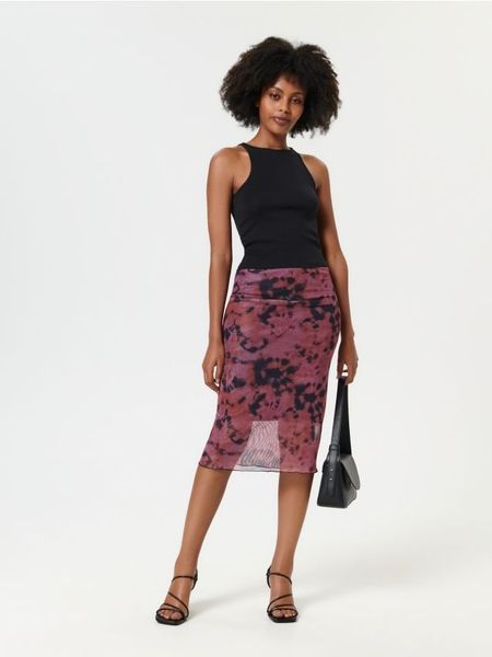 Wzorzysta spódnica o dopasowanym kroju, uszyta z szybkoschnącego materiału z dodatkiem elastycznych włókien.