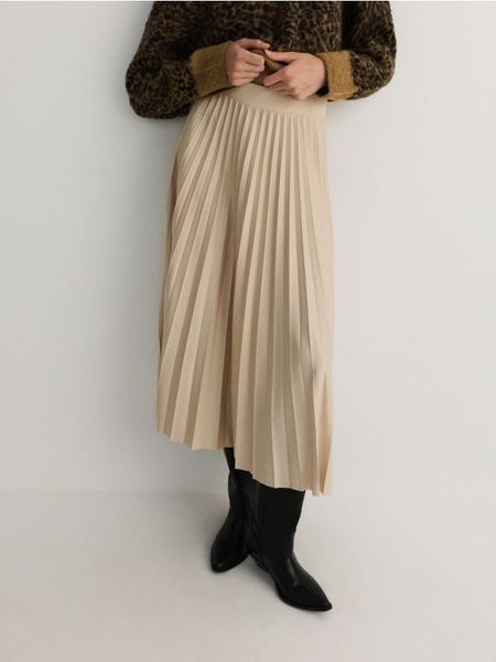 Spódnica maxi o rozkloszowanym fasonie, wykonana z plisowanej dzianiny.