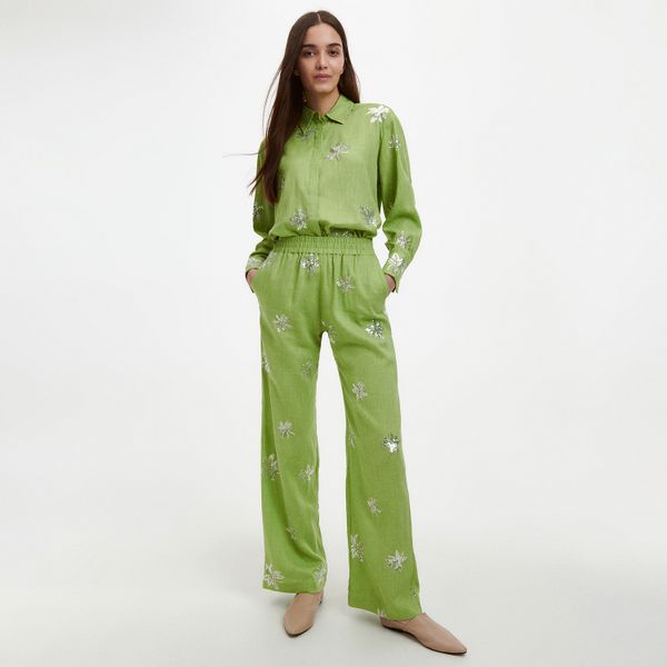 Spodnie o swobodnym kroju, wykonane z przewiewnej tkaniny – mieszanki lnu i bawełny.