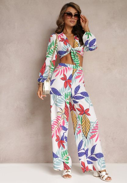 Kwiecisty, 2-częściowy komplet Francessa z szerokimi spodniami z gumką w talii. Górna część do bluzka z długimi rękawami i wiązaniem z przodu. Komplet stworzony na sezon wiosna/lato.