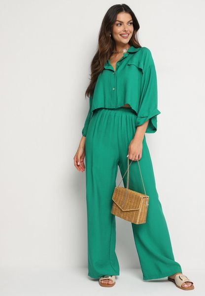 Zielony Komplet z Wiskozą Koszula Ściągana w Talii i Szerokie Spodnie Divellara