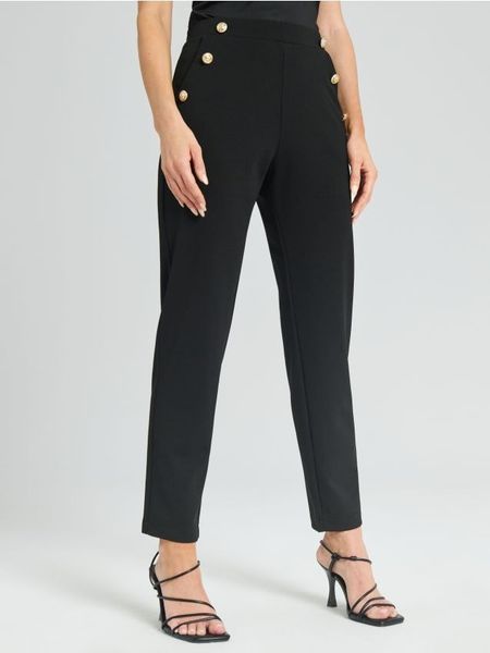 Spodnie z prostą nogawką, ozdobione guzikami. Uszyte z materiału odpornego na blaknięcie z dodatkiem elastycznych włókien.