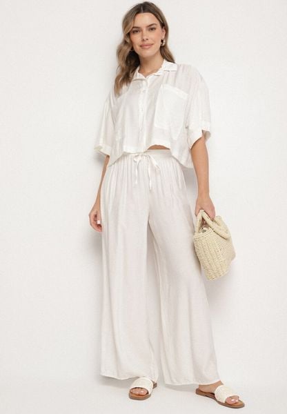 Biały Komplet z Wiskozy Koszula z Podpinanymi Rękawami i Szerokie Spodnie Dormoi
