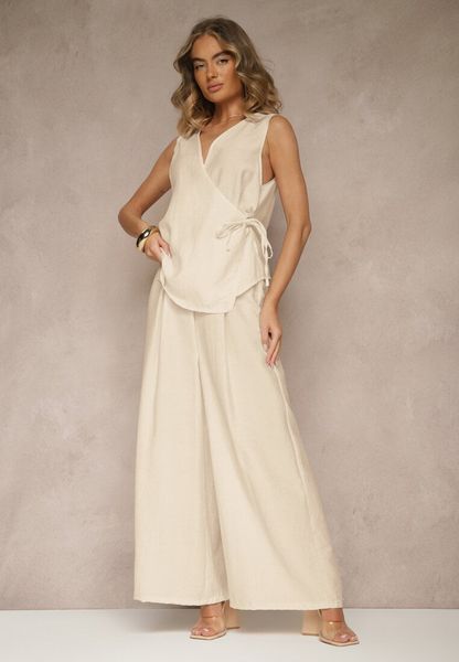 Beżowy Komplet z Lnem Spodnie o Szerokim Kroju i Bluzka z Wiązaniem Idanira