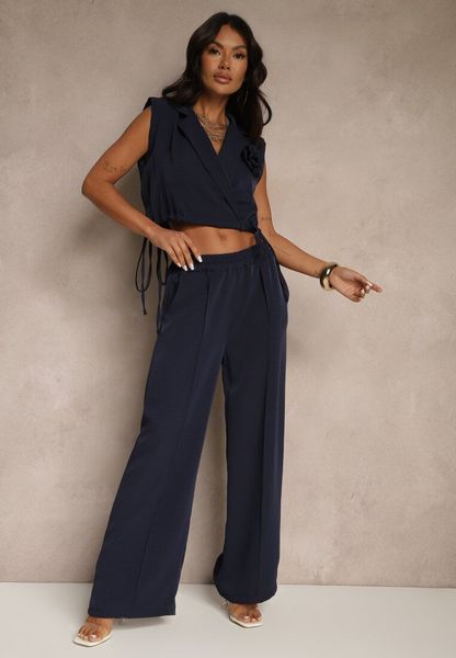 Granatowy Komplet Spodnie o Szerokim Kroju i Kopertowa Bluzka ze Ściągaczem Reavilora