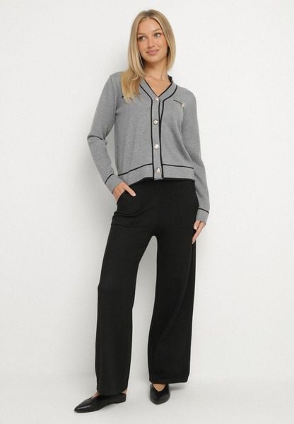 Szary Dzianinowy Komplet Szerokie Spodnie i Kardigan z Lamówkami Gioresa