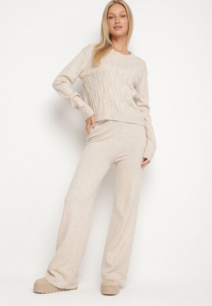 Jasnobeżowy Dzianinowy Komplet z Wełną i Bawełną Sweter z Tłoczonym Wzorem i Spodnie Otivra