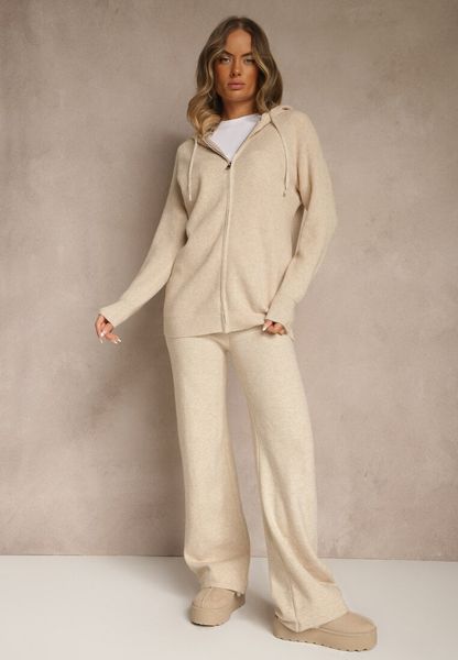 Beżowy Dzianinowy Komplet Dresowy z Wełną Bluza z Kapturem i Spodnie Essana