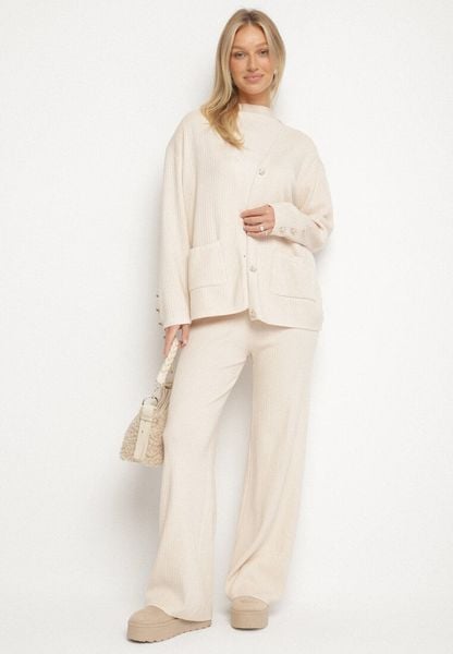 Jasnobeżowy Dzianinowy Komplet Szerokie Spodnie i Kardigan z Lamówkami Gioresa