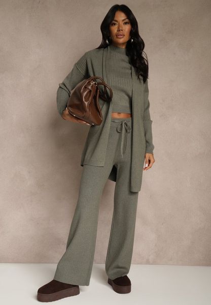 Ciemnozielony Komplet z Dzianiny z Wiskozą Spodnie Bluzka ze Stójką i Kardigan Vetisene