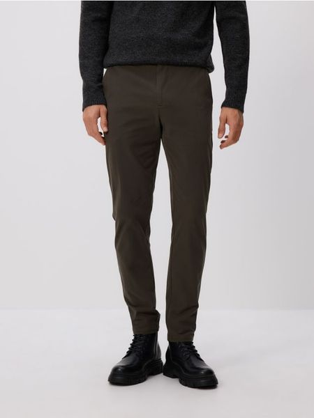 Spodnie typu chino o dopasowanym kroju, wykonane z tkaniny z bawełną.