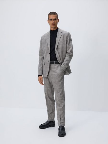Spodnie typu carrot o dopasowanym kroju, wykonane z tkaniny z domieszką wiskozy.