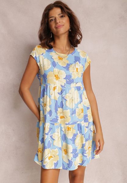 Sukienka Predikel mini, z krótkimi rękawami. Zwieńczona na dole falbaną. Z okrągłym dekoltem i trójkątnym wycięciem na plecach. Wiązana tuż przy karku na materiałowe paski w dopasowanym wzorze. Zdobiona kolorowym wzorem w kwiaty. Bez podszewki. Noś ją np. do gładkich sandałków i pikowanej torebki.