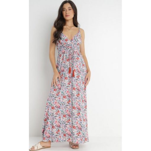 Sukienka Argaea na cienkich ramiączkach z wygodną regulacją długości. Długość maxi. Ściągana w pasie wiązanym sznurkiem. Głęboki, kopertowy dekolt. Z tyłu na wysokości pasa wszyto elastyczne gumki. Wykonana z wiskozy, pokryta wzorem w kolorowe kwiaty. Sukienka nie ma podszewki. Długa, letnia sukienka w kwiaty będzie pięknie prezentować się z ażurowymi balerinami.