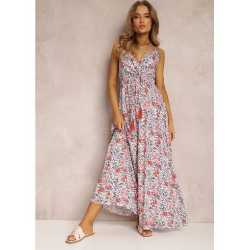 Sukienka Auxeris z wiskozy, pokryta kwiatowym printem. Góra kopertowa, z głębokim dekoltem i cienkim, regulowanymi ramiączkami. Ściągana wokół talii. Z tyłu szeroki ściągacz z wąskich, elastycznych gumeczek. Model bez podszewki. Dobierz do niej kolorową torebkę i wysokie sandały marki renee.