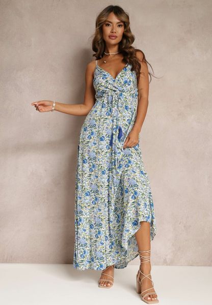 Sukienka Auxeris z wiskozy, pokryta kwiatowym printem. Góra kopertowa, z głębokim dekoltem i cienkim, regulowanymi ramiączkami. Ściągana wokół talii. Z tyłu szeroki ściągacz z wąskich, elastycznych gumeczek. Model bez podszewki. Dobierz do niej kolorową torebkę i wysokie sandały marki renee.