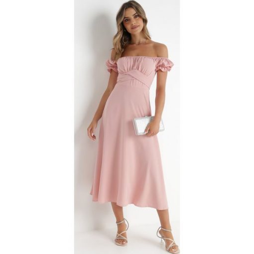 Różowa Sukienka Midi z Dekoltem Carmen i Bufiastymi Rękawkami Amarhis