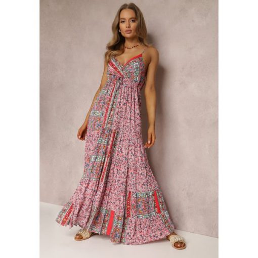 Sukienka Fihi o długości maxi, z gumką pod biustem. Udekorowana w całości kolorowym, patchworkowym wzorem. Góra z głębokim, kopertowym dekoltem i cienkimi, regulowanymi ramiączkami. Do dołu doszyta falbanka. Wykonana z wiskozy, bez podszewki. Gumka w pasie po rozciągnięciu mierzy: S/M 91, L/XL 95 cm. Idealna do stylizacji boho z plecionymi sandałami.