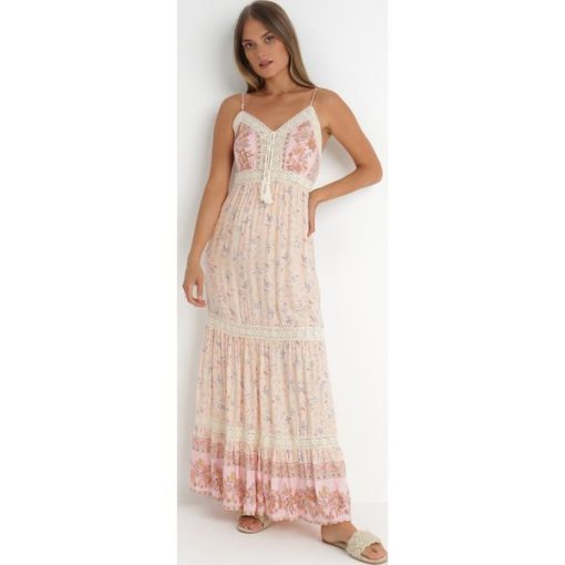 Sukienka Bakrey na cienkich, regulowanych ramiączkach. O długości maxi, zachwyca efektownym, orientalnym printem w kwiaty. Zdobiona koronkowymi wstawkami na całej długości. Przy dekolcie ozdobne wiązanie zakończone chwostami. Wykonana z wiskozowej tkaniny. Rozkloszowana, kwiecista sukienka maxi to must-have na sezon letni!