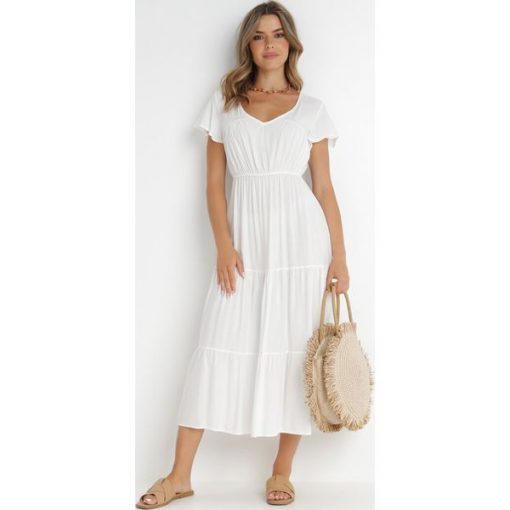 Biała Sukienka z Wiskozy o Rozkloszowanym Kroju Folky