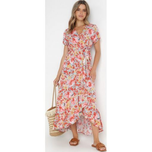 Sukienka Varila midi, o kopertowym fasonie. Głęboki dekolt. Rękawy krótkie. Wykończona na dole falbaną. Asymetryczna, z dłuższym tyłem. Wiązana na boku materiałowym paskiem. W talii gumka rozciągająca się do: S = 75 cm, M = 78 cm, L = 83 cm, XL = 87 cm. Sukienka nie ma podszewki. Wykonana z wiskozy, doskonała na lato. […]