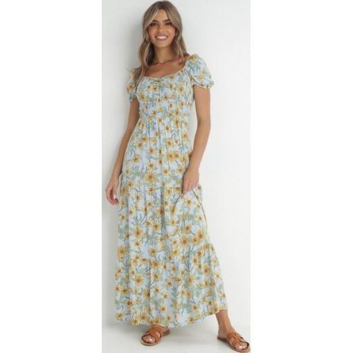 Sukienka Bloch maxi z tkaniny w kwiaty. Dekolt głęboki, trójkątny. Góra z wszytą z przodu marszczoną gumką od dekoltu aż do linii talii. Rękaw krótki, lekko bufiasty, z cienką gumką na krawędziach. Z tyłu ozdobne wiązanie gorsetowe. Model nie ma wszytej podszewki. Rozkloszowany dół obszyty zwiewną falbanką. Śliczna, wiosenno-letnia sukienka z pewnością urozmaici Twój outfit. […]