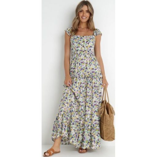 Sukienka Maibe maxi, na ramiączkach ozdobionych delikatną falbanką. Z tyłu wszyte cienkie gumki. Okrągły, głęboki dekolt zdobiony guzikami. Model bez podszewki, wykonany z tkaniny w kwiatowy print. Na dole znajduje się lekka falbana. Sukienka w stylu boho to romantyczna, kobieca propozycja na wiosenno-letni czas. Dopasuj do niej buty na koturnie i lekką, plecioną torbę trapezową.