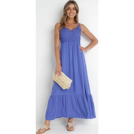Sukienka Stheuse maxi, na regulowanych, cienkich ramiączkach. Na plecach wszyte cienkie gumki. Góra ozdobiona została delikatną koronką, dekolt głęboki, w kształcie trójkąta. Model ma wyraźne odcięcie w talii, dzięki czemu sukienka pięknie się układa. Na dole lekka falbana. Bez wszytej podszewki. Model wykonany z gładkiej tkaniny. Sukienka fit & flare w eleganckim stylu doskonale będzie […]
