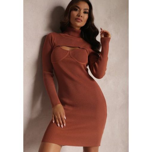 Sukienka Varia mini, wykonana z prążkowanej dzianiny. Dopasowany fason, z golfem oraz długim rękawem. Przy dekolcie zdobiona subtelnym wycięciem oraz przeszyciem podkreślającym biust. Bez podszewki. Poszukujesz szykownej, kobiecej sukienki na chłodniejsze dni? Model Varia z pewnością Cię zachwyci!