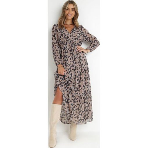 Beżowo-Szara Kopertowa Sukienka w Abstrakcyjny Wzór z Gumką w Talii i Paskiem Zinnitaria