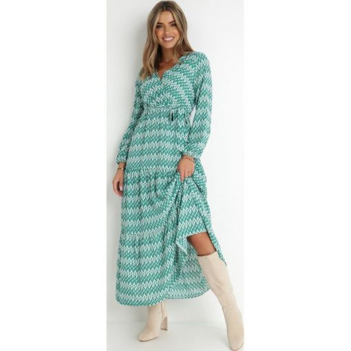 Zielona Kopertowa Sukienka z Gumką w Pasie i Materiałowym Paskiem z Wiskozy Dionienne