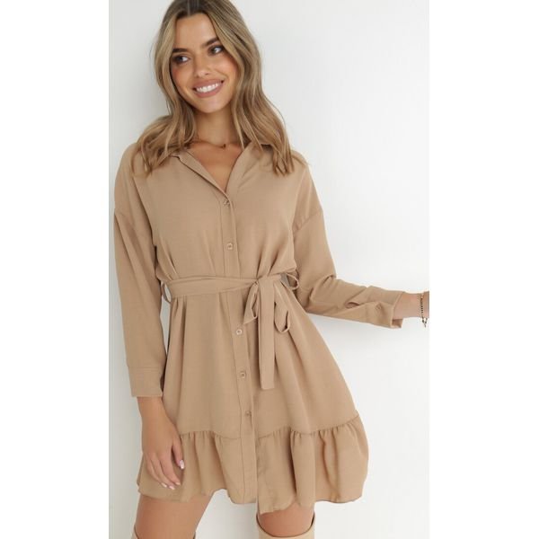 Beżowa Sukienka Koszulowa z Falbanką i Wiązanym Paskiem Fian