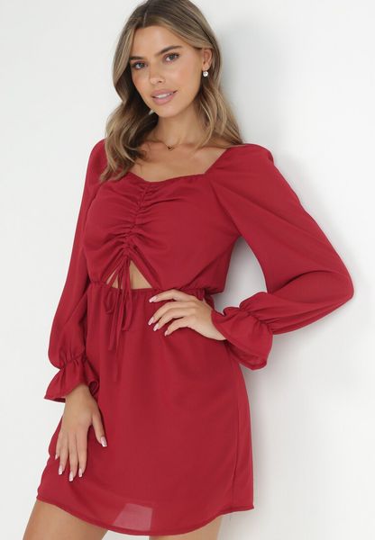 Bordowa Sukienka z Błyszczącą Nitką i Ściągaczem z Przodu Gissi