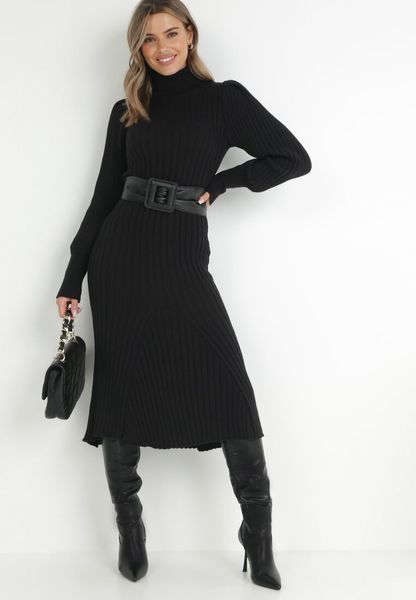 Czarna Sukienka Dzianinowa z Golfem i Szerokim Paskiem Yamilile