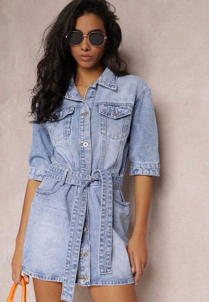 Niebieska Sukienka Koszulowa z Jeansu z Paskiem i Guzikami Avaleen