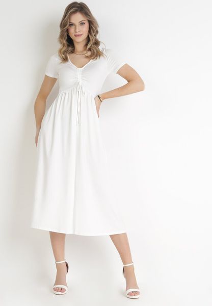 Sukienka Ionene z głębokim, trójkątnym dekoltem. Przy dekolcie drapowanie, zakończone cienkim sznurkiem z tego samego materiału. Krótki rękaw. W pasie wszyta elastyczna gumka, która tworzy lekkie plisy od talii w dół. Długość midi. Nie posiada podszewki. Gumka w pasie po rozciągnięciu mierzy: S 91, M 94, L 99 cm. To doskonały fason do codziennych stylizacji […]