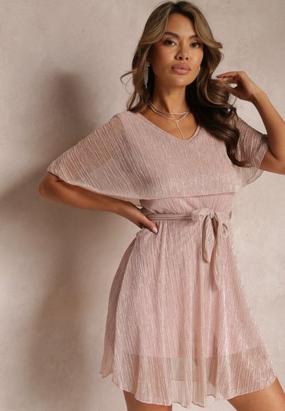 Różowa Sukienka Mini z Metaliczną Nitką i Gumką w Pasie Eullas