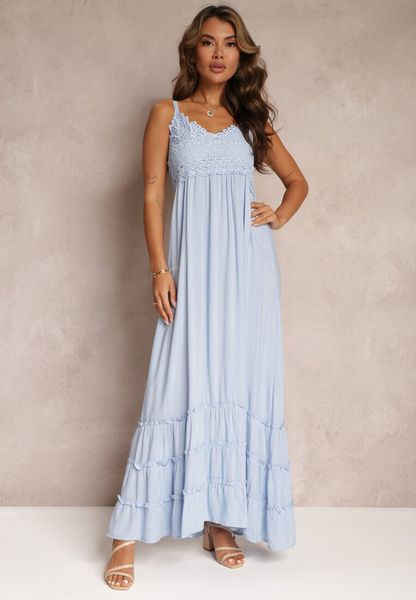 Niebieska Rozkloszowana Sukienka Maxi z Koronką i Głębokim Dekoltem Zonila