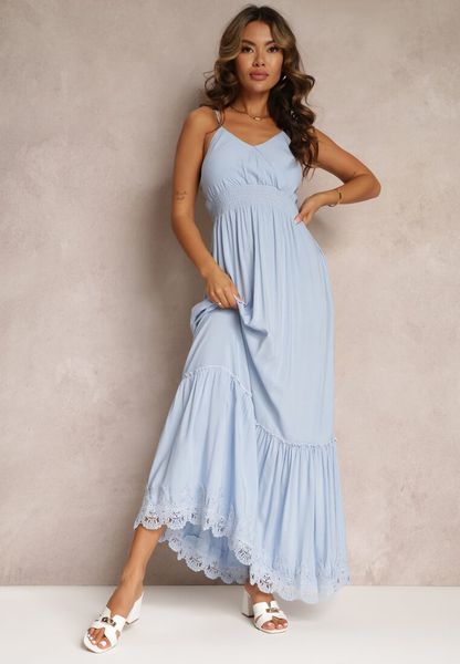 Niebieska Rozkloszowana Sukienka Maxi na Cienkich Ramiączkach z Gumką w Talii i Kopertowym Dekoltem Onveva
