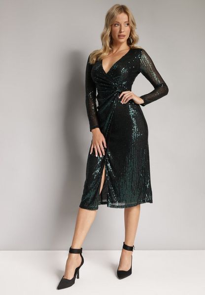 Zielona Cekinowa Sukienka Midi z Kopertowym Dekoltem i Wiązaniem Hadora
