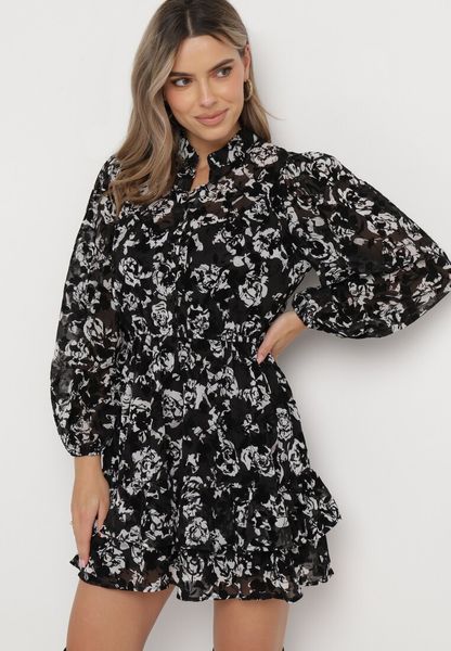 Czarna Rozkloszowana Sukienka Mini w Kwiaty z Falbanką Matera