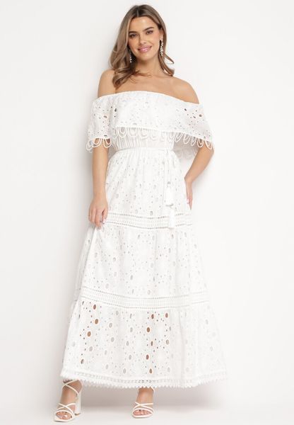 Biała Bawełniana Sukienka Maxi w Stylu Boho Ozdobiona Ażurowym Haftem Hellvia