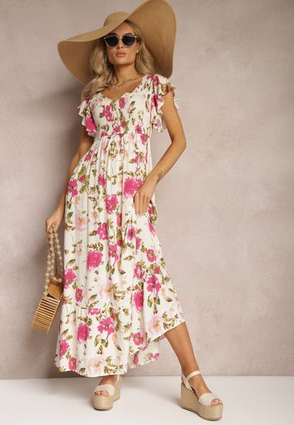 Jasnobeżowa Wiskozowa Sukienka w Kwiatowy Print Rozkloszowana Maxi Veradisia