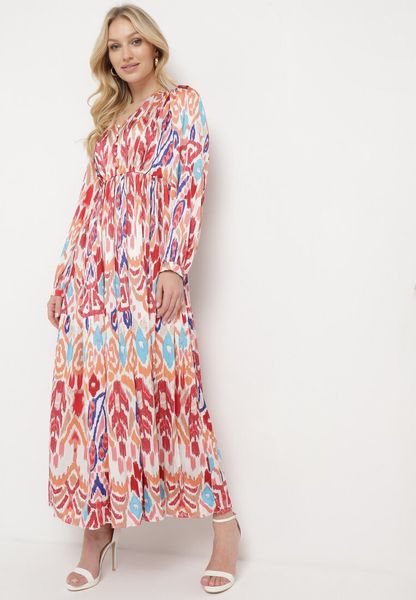 Bordowo-Beżowa Sukienka Maxi z Wzorem Etno i Gumką w Talii Junimiza