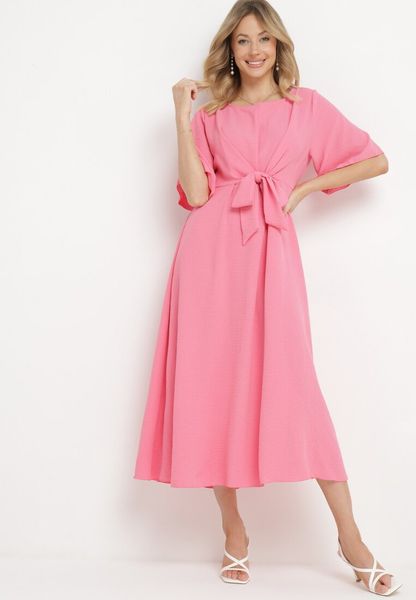 Różowa Sukienka Maxi z Ozdobnym Wiązaniem i Gumką w Talii Myrcella