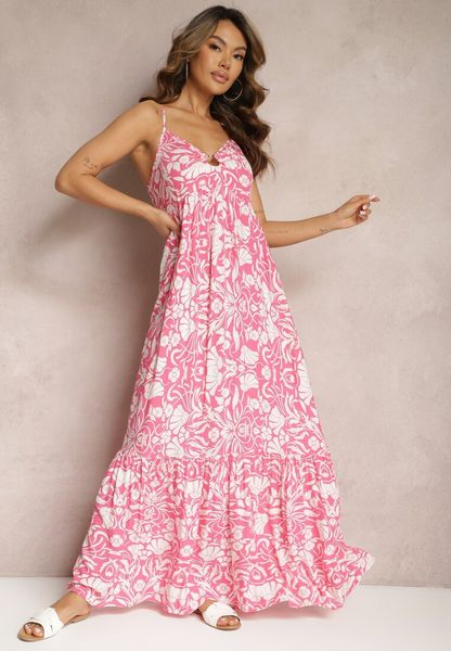 Fuksjowa Sukienka Maxi z Bawełny na Cienkich Ramiączkach z Falbanką i Kwiatowym Printem Miora