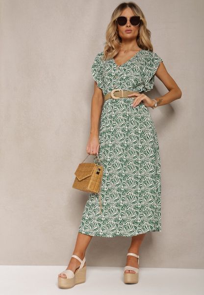 Zielono-Beżowa Sukienka z Wiskozy z Gumką w Pasie i Falbankami Przy Ramionach Siham