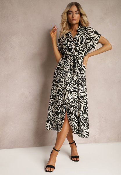 Czarno-Biała Sukienka o Koszulowym Kroju z Materiałowym Paskiem w Talii w Kolorowy Print Hilefia